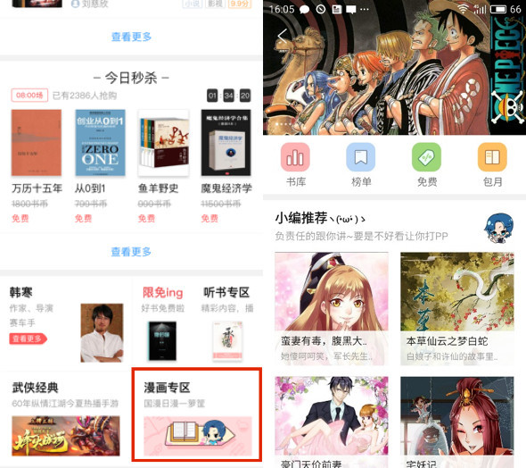 测试版的漫画书城最顶端设立了书库、榜单、免费、包月四个入口,方便用户分类目寻找资源。除此之外,QQ阅读还根据用户的偏好和漫画风格,将整个漫画书城进行了分类。譬如有口皆碑的"封神之作"专栏、备受瞩目的"人气周榜"专栏,以及"日漫馆"、"韩漫馆"、"更新志"、"完结书"等,这些专栏的设立无疑将为用户找漫画提供更多便利。