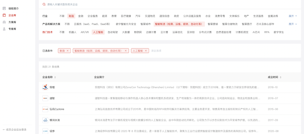 在点击了左侧导航栏的“企业库”后,用户可选择通过“行业”、“产品和解决方案”和“热门技术”下的具体标签精确搜索目标企业,也可通过上方的搜索框直达感兴趣的企业。