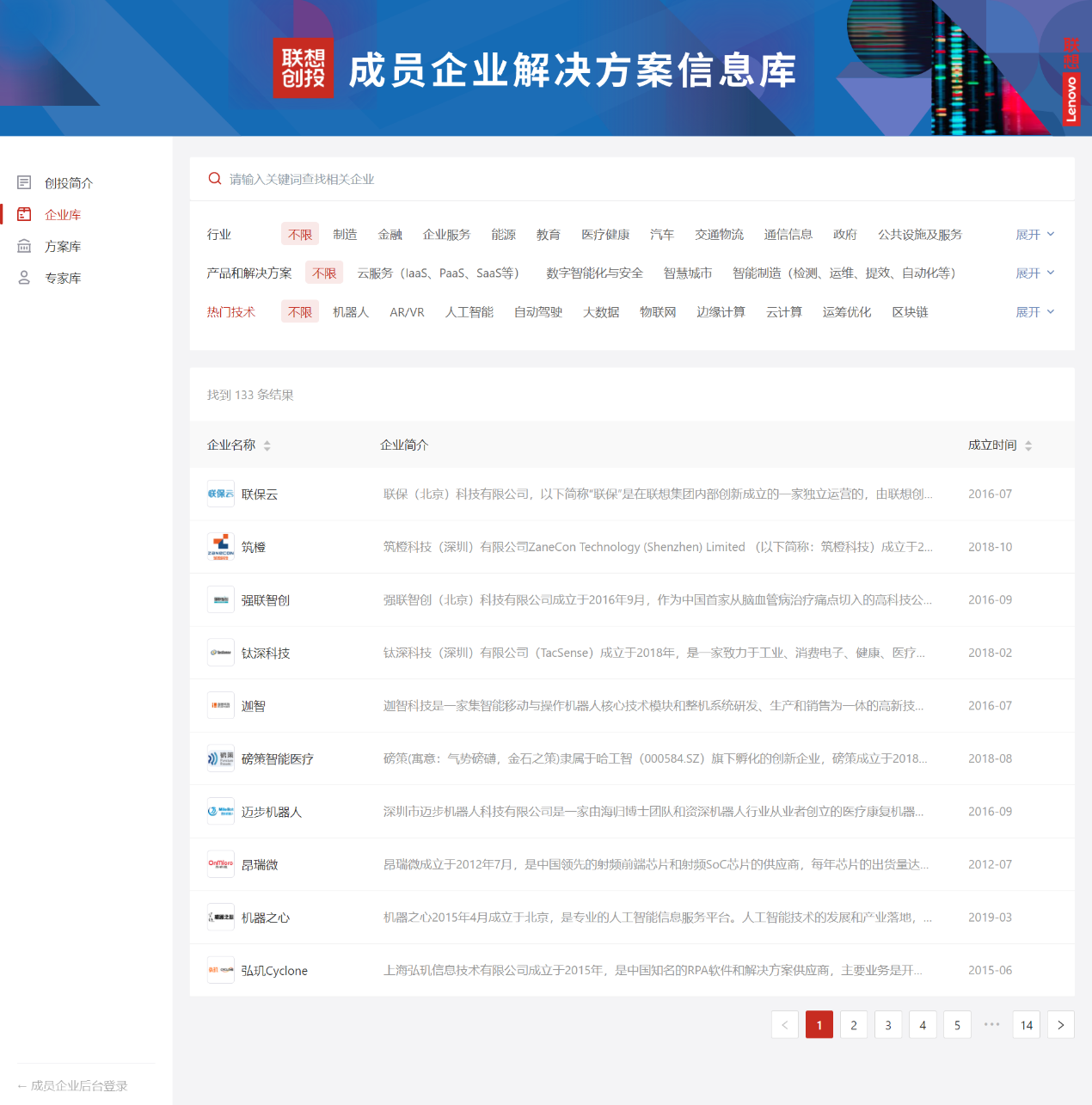 该数据库覆盖了联想投资的160多家高科技成员企业,包含每家企业的解决方案、服务客户和专家信息,通过“技术”、“产品”和“行业”等多维度标签,可一键找到与客户需求相匹配的方案和公司。它不仅清晰、详尽地将联想创投成员企业及方案进行了分类展示,还将保持实时更新,不断进行信息延展扩充。用户、行业销售和架构师,从此可以随时随地便捷地查询各种解决方案。数据库链接:http://lenovo.jiqizhixin.com