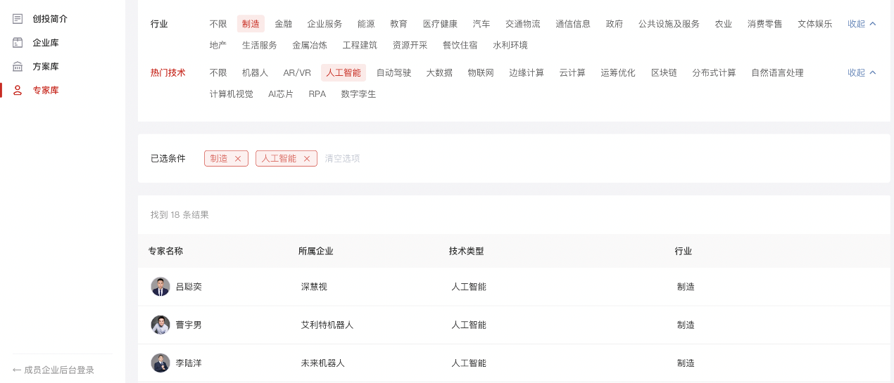 “专家库”包含了多位行业顶尖科学家和资深专家的信息,展现了联想成员企业高精尖的人才、技术储备能力。用户可以通过“行业”和“热门技术”分类标签查找细分行业和技技术背景下的专家信息。
